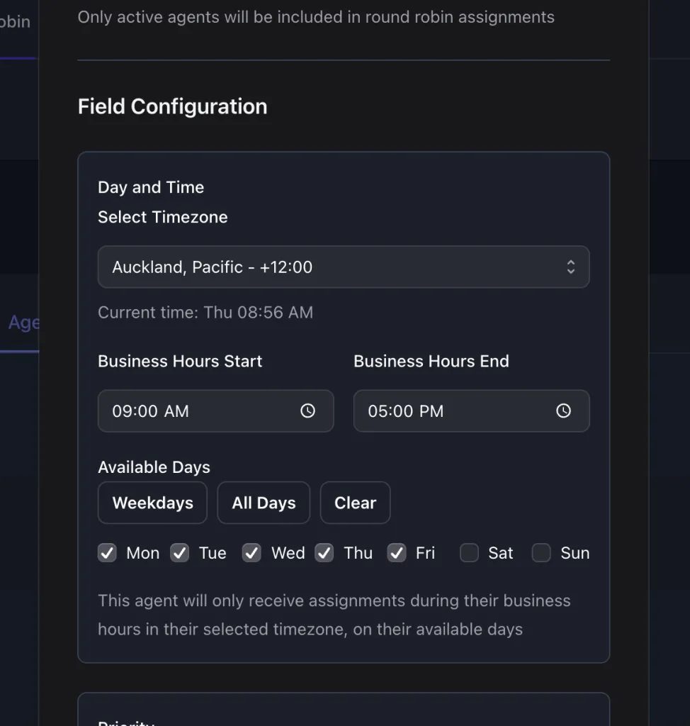 - Day and Time – Used when you want to route a request based on an agent’s availability. You can set the agent’s working hours and days.
